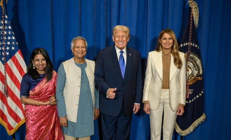 Professor Yunus was accompanied by his daughter, Deena Yunus. During the reception, President Trump and First Lady Melania posed for a photo with Professor Yunus and Deena, marking a moment of cordial exchange.