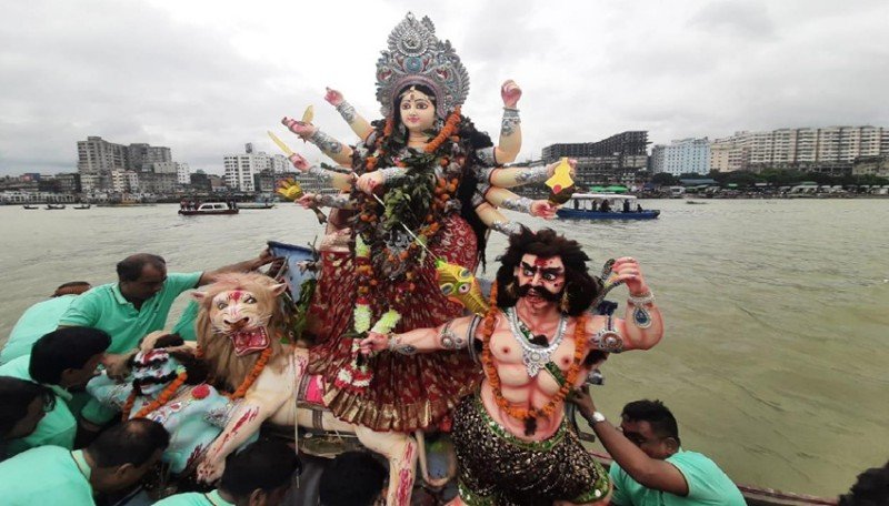 In Dhaka, thousands of worshippers gathered along the banks of the Buriganga River to witness the final ritual of the festival.