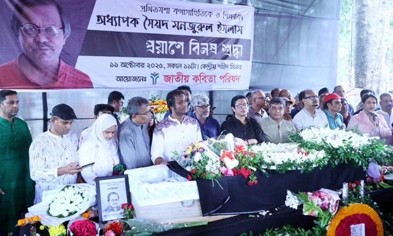 People from all walks of life on Saturday paid their last tribute to eminent writer, essayist, and Emeritus Prof of the English Department at Dhaka University Syed Manzoorul Islam at Aparajeyo Bangla of Dhaka University and the Central Shaheed Minar.