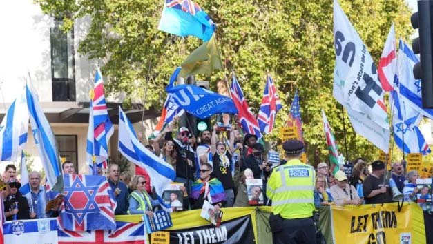 Images showed a sea of Palestinian flags being carried over Westminster Bridge while a small group of counter-protesters gathered nearby, with many holding Israeli flags and signs calling for the return of hostages.
