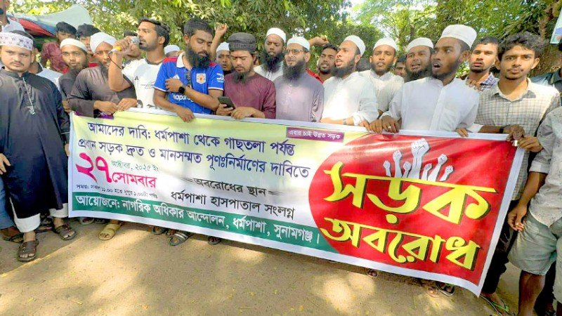 Thousands of residents in Sunamganj’s Dharampasha upazila staged a two-hour road blockade on Monday, demanding immediate and quality reconstruction of a 10-kilometre road which connects two upazilas.