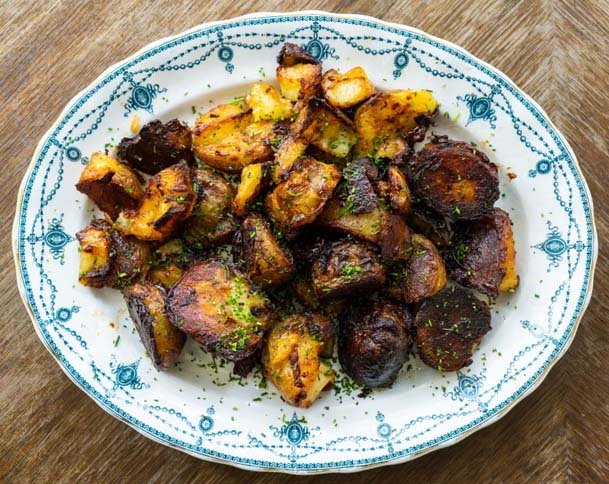 I’ve always been fanatical about Marmite, so much so that I refuse to waste a single scoop. I used to wrestle with a butter knife, scraping endlessly at the jar’s sticky bottom, until I learned that there’s a reason the rounded pot has a small flat spot on each side. When you get close to the end of the jar, store the pot on its side, so the last of that black gold inside pools neatly into the side for easy removal. Those stubborn dregs work brilliantly in this recipe, and transform your roast spuds into the most flavour-packed ones you’ll ever eat. But go easy: Marmite is potent stuff, and even the last few scrapings will go a long way.