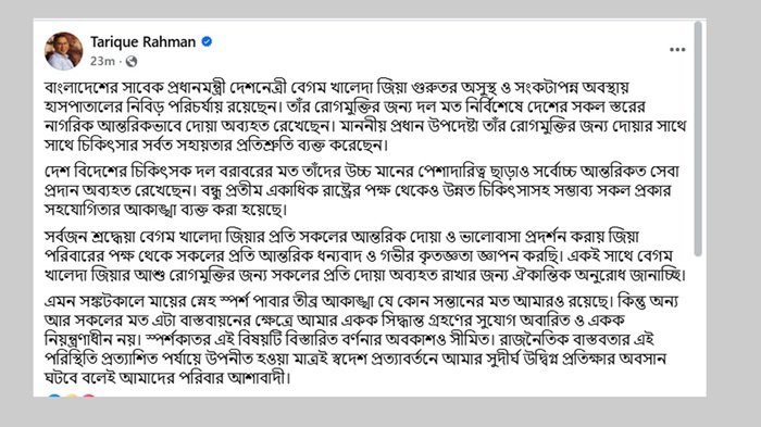“On behalf of the Zia family, we express our sincere thanks and deep gratitude to everyone for their heartfelt prayers and love for the widely respected Begum Khaleda Zia. At the same time, we earnestly request everyone to continue praying for her speedy recovery.”