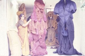 technique of macramé, creating monumentally-scaled freestanding soft sculptures with an embodied