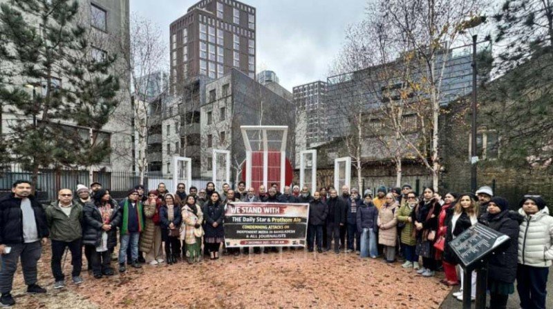 Journalists, media professionals, cultural activists, and members of the British Bangladeshi community gathered at the Altab Ali Park in East London on Sunday to protest the attacks on Bangladesh’s leading newspapers, The Daily Star and Prothom Alo, and growing threats against journalists.
