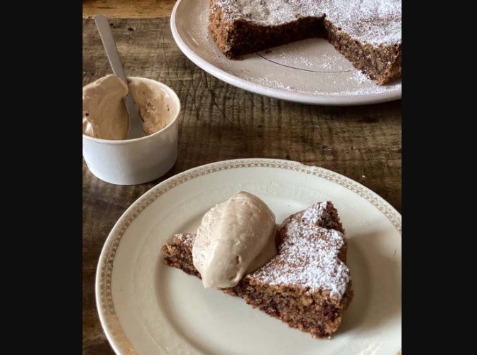 Heat the oven to 180C (160C fan)/350F/gas 4 and line a 24cm round cake tin with baking paper. Working in a food processor, pulse 250g whole, shelled, toasted hazelnuts or cobnuts until they form a rough flour, then add 200g roughly chopped dark chocolate and pulse again until you have a sandy mixture. In another bowl, beat together 200g room temperature butter and 150g caster sugar until soft and light, then beat in four egg yolks one by one, before stirring in the chocolate and an optional two tablespoons of plain flour. Whisk the four egg whites in a separate bowl until they form stiff peaks, then carefully fold them into the cake batter. Scrape the lot into the prepared tin and bake for 40 minutes, or until the cake is more or less firm but with a tender middle. Don’t worry if the cake sinks at the centre – this is to be expected.