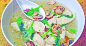 Ingredients: * 1 liter Chicken broth * 200 gms Chicken breast, thinly sliced * 2 cloves Garlic, minced * 1 piece Ginger, sliced * 2 tbsps Fish sauce * 1 tsp Sugar * 100 gms Mushrooms, sliced * 2 pieces Green onions, chopped * 1 handful Cilantro, chopped Method: 1. In a pot, bring the chicken broth to a boil. ...